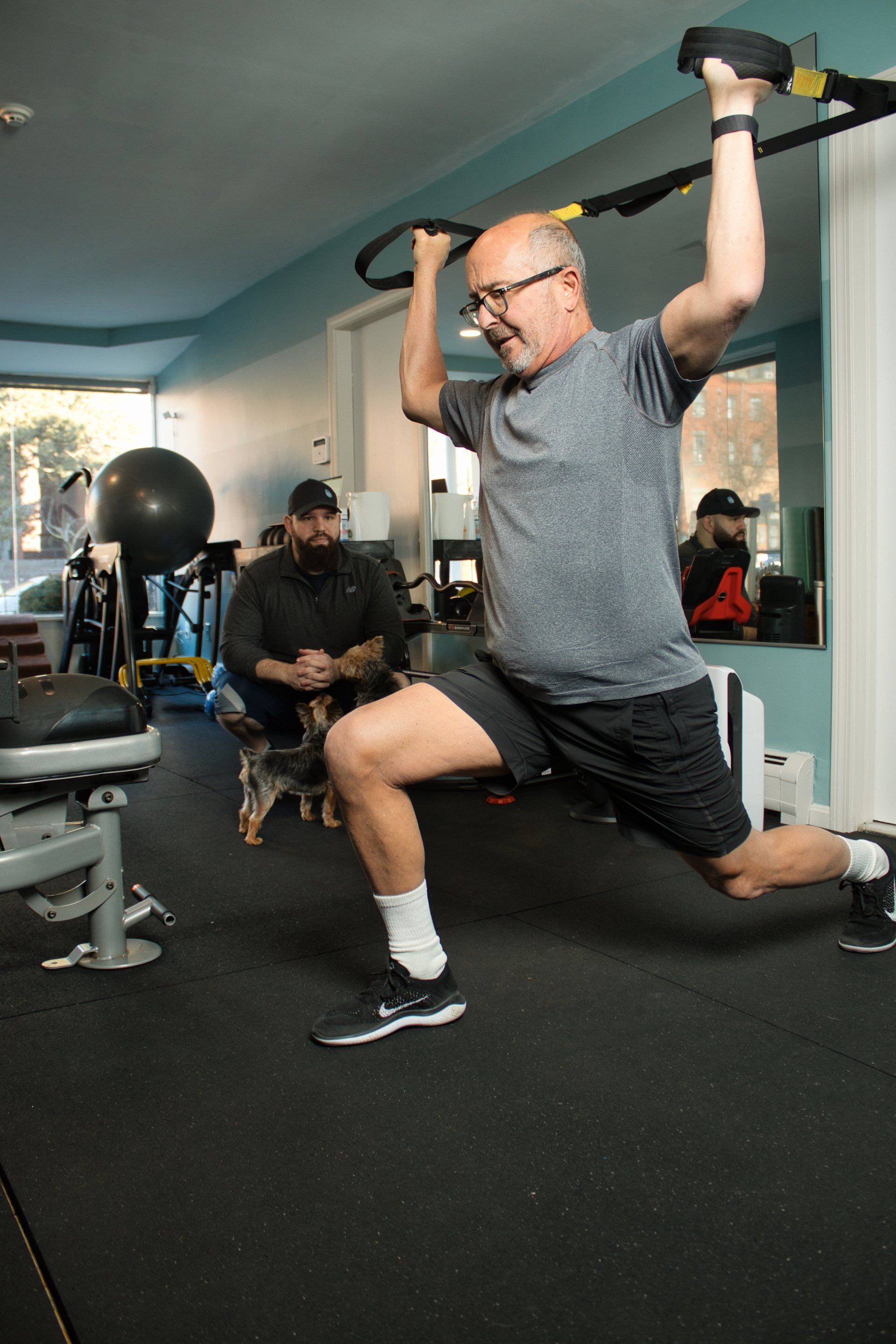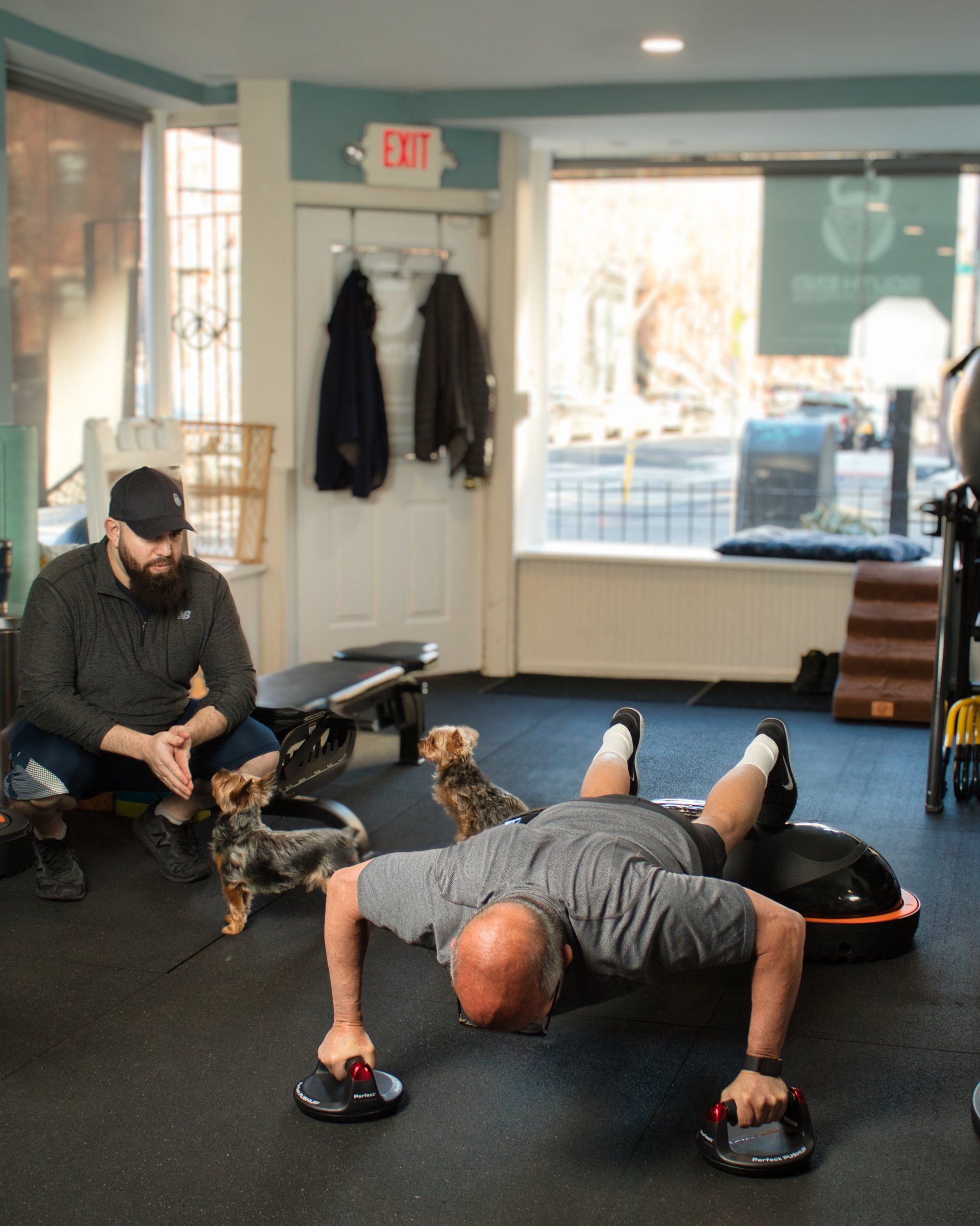 Our training studio is equipped with everything you need for your fitness journey. Beyond the equipment for your training, you'll also find a full bathroom complete with towels and a changing room. We provide everything needed for both your workout and your comfort. Everything in our space has a purpose - except for the dogs, who are just cute.